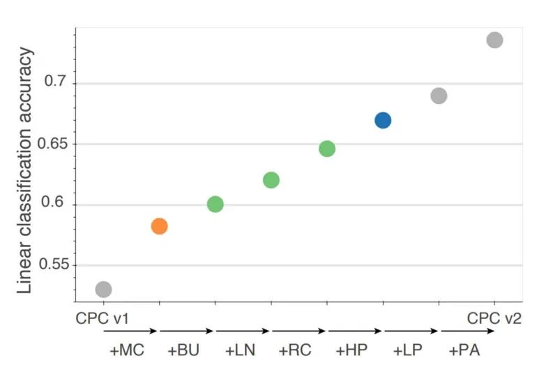 在此基础上,作者通过叠加一系列的改进来构建 CPC v2,从而使最终精度大幅提高,如上所示。详细信息在文章中,但我将强调上面两个最大的提升。