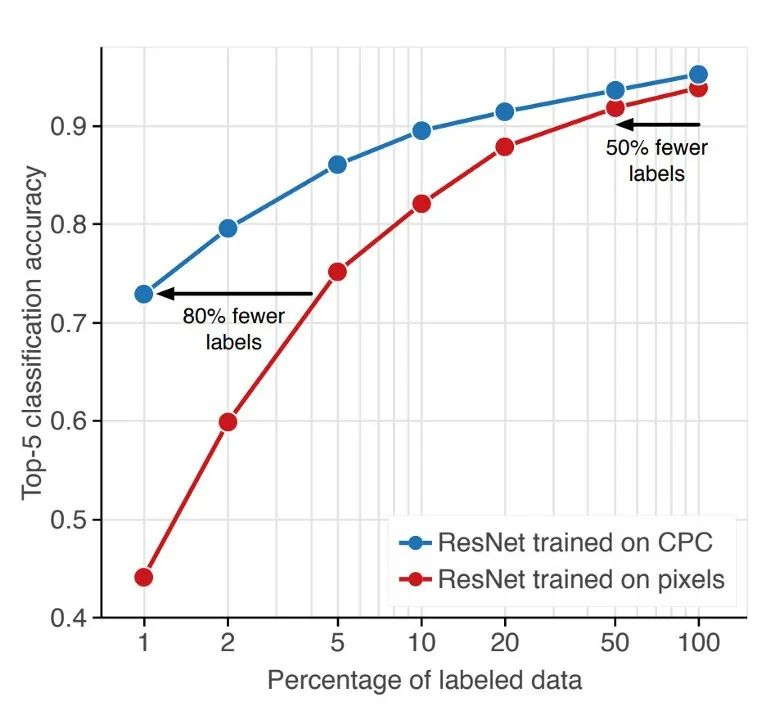 然而,由于Deep Mind早期突破性的“CPC”(即Contrastive Predictive Coding)的新改进,导致对大量标记数据的需求,在表示能力方面的差距现在可能正在迅速缩小。