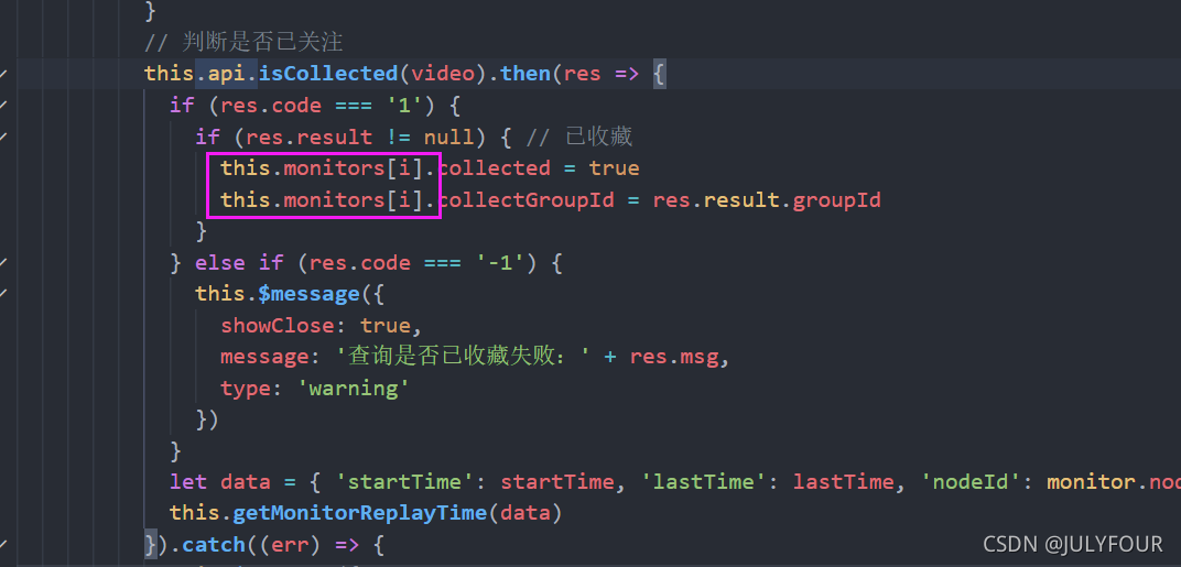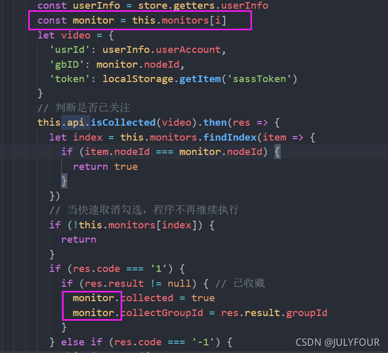 - 业务场景:有一棵摄像头列表的树,每个摄像头有一个复选框,可以勾选和取消勾选,把已经勾选的摄像头信息保持到一个数组里面,勾选时往数组里面添加元素,取消勾选时从数组里面删除元素,每次数组内容变化就会触发一个请求去拿摄像头的播放地址,这里请求前和请求后都会用到数组元素,最开始写代码的时候每次都通过数组下标去取元素,结果导致的问题就是,因为请求后台接口涉及到异步操作,如果快速取消刚刚的勾选,等请求返回再根据下标取数组元素就会报错:
