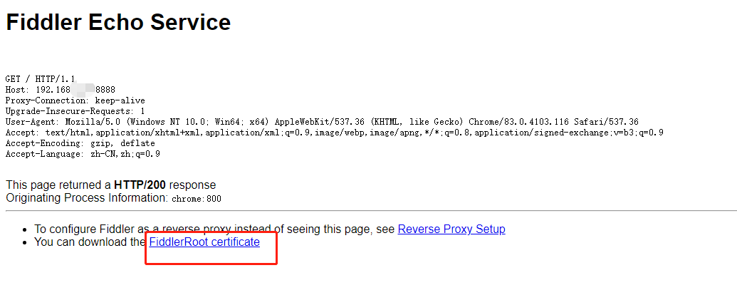 例如:http://192.168.1.101:8888/,打开看的以下页面,点击:FiddlerRoot certificate下载证书。这样就安装了证书了,可以抓HTTPS的包的。