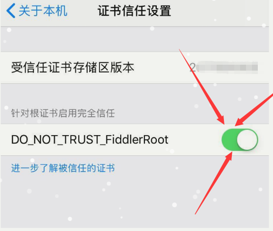 3、进入设置->关于本机->证书信任设置,勾选fiddler的证书即可。苹果手机多一步【设置】