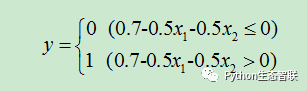 与非门表明只要有一个输入信号为0,则输出就为1,上式满足此条件。该公式表示的感知机生成了由直线0.7-0.5x1-0.5x2=0分割开的两个空间,如下图所示,一个空间输出0,一个空间输出1。