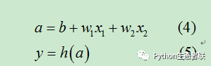 我们刚引入的h(x)函数能将输入信号的总和转换为输出信号(只有0和1),这种函数就是激活函数。正如“激活”二字,激活函数就是决定如何来激活输入信号的总和。读者意识可能有点模糊,我们对上面的式子再分析一下,将式(2)分为两个阶段,如下式,第一阶段是计算输入信号的加权和,第二阶段则用激活函数来转换这一加权和。