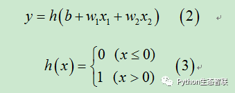 式(2)中,输入信号的总和会被函数h(x)转换,转换后的值就是输出y。而式(3)所表示的h(x)在输入超过0时返回1,否则返回0。不难理解,式(1)和式(2)、(3)做的是一件事情。其实这和数学中的复合函数的意思一样(将b+w1x1+w2x2整体作为变量x,变量名可随便取)。