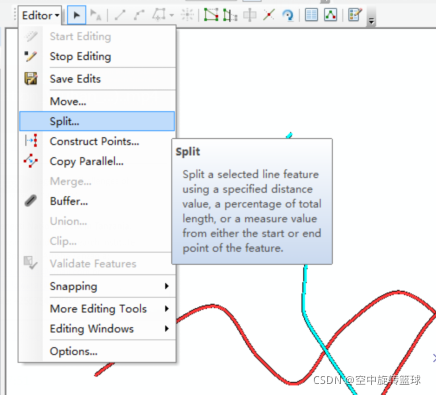 Editor-split工具,选中待编辑要素后,激活该工具,一次只能选中一条线,也就是只能编辑一条线。