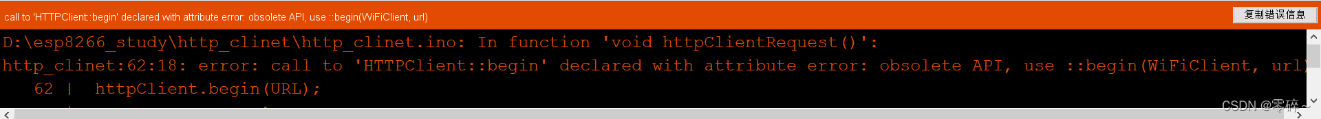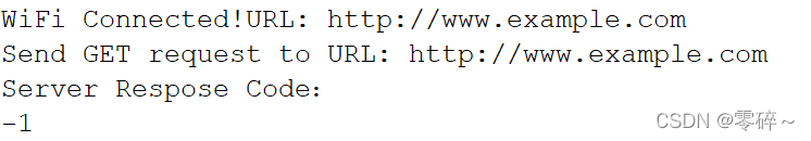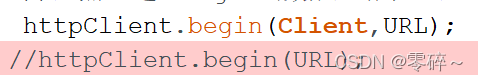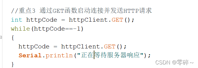 void httpClientRequest(){//重点1 创建 HTTPClient 对象HTTPClient httpClient;//重点2 通过begin函数配置请求地址。此处也可以不使用端口号和PATH而单纯的httpClient.begin(Client,URL); //httpClient.begin(URL); Serial.print("URL: "); Serial.println(URL);//重点3 通过GET函数启动连接并发送HTTP请求int httpCode = httpClient.GET();Serial.print("Send GET request to URL: ");Serial.println(URL);//重点4. 如果服务器响应HTTP_CODE_OK(200)则从服务器获取响应体信息并通过串口输出//如果服务器不响应HTTP_CODE_OK(200)则将服务器响应状态码通过串口输出if (httpCode == HTTP_CODE_OK) {// 使用getString函数获取服务器响应体内容String responsePayload = httpClient.getString();Serial.println("Server Response Payload: ");Serial.println(responsePayload);} else {Serial.println("Server Respose Code:");Serial.println(httpCode);}//重点5. 关闭ESP8266与服务器连接httpClient.end();