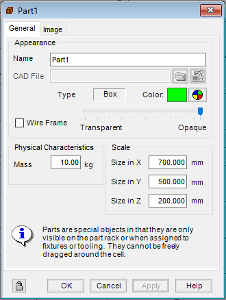 使用软件自带的建模功能创建“Box”类型模型作为输送物料,物料名称为默认的“Part1”,物料尺寸为Size in(X,Y,Z)=(700,500,200)。