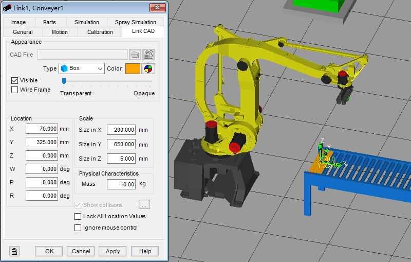 Link1属性对话框中选择“Link CAD”选项卡,在Scale功能区中设置Link1的尺寸为Size in(X,Y,Z)=(200,650,5),Location功能区中设置Link1位置为(X,Y,Z,W,P,R)=(70,325,0,0,0,0),即位于输送带的输送起始点位置处,如下图所示。