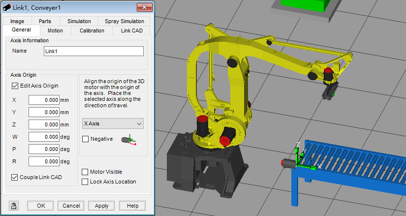 在“General”选项卡中可以设置Link1的驱动电机属性参数。首先在Axis Origin功能区下勾选“Edit Axis Origin”选项,软件工作区中显示出驱动电机模型。然后在电机方向设置框下点选“X Axis”,使得电机的驱动对象沿着或绕着X轴运行。