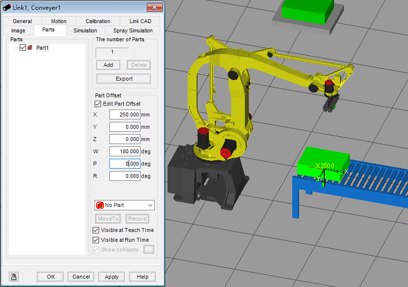 Part Offset功能区中勾选“Edit Part Offset”选项,然后设定输送物料的偏移位置为(X,Y,Z,W,P,R)=(250,0,0,180,0,0),也就是位于输送带的Link1模型上,如下图所示。