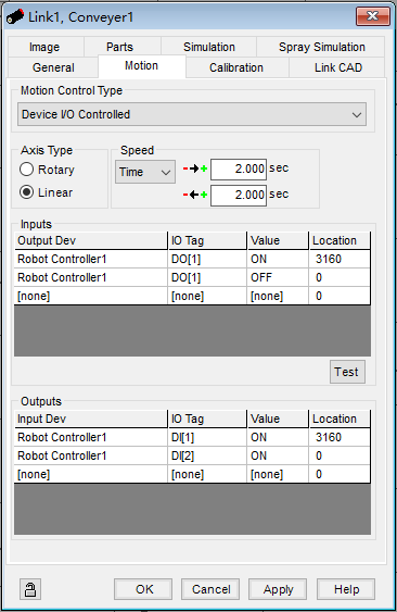 Inputs:设置驱动电机控制信号,本例中信号控制器选择为机器人控制器“Robot Controller1”,信号为“DO[1]”。即当机器人信号DO[1]被置位时,输送带Link1运行3160mm;当机器人信号DO[1]被复位时,输送带Link1返回起始点位置。