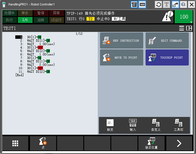 打开机器人虚拟示教器,利用机器人输出信号DO[1]与输入信号DI[1]、DI[2]编写输送带运行控制程序,编写完成后的程序如下图所示。