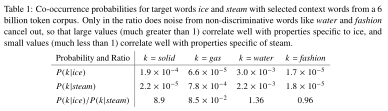 统计了目标词“ice”和“steam”在含60亿词的语料库上构建的共现概率,因为只有在这种规模的语料库下才能抵消“water”和“fashion”这样的噪声。从实验结果可以看到,比值更大的词(solid)与“ice”的特性跟相关,比值更小的词(gas)与“steam”的特性更相关。这种方式与原有概率比较可以发现,这个比值既能区分相关词和不相关词(solid、gas与water、fashion),也能很好地区分两个相关词(solid和gas),所以得出结论: