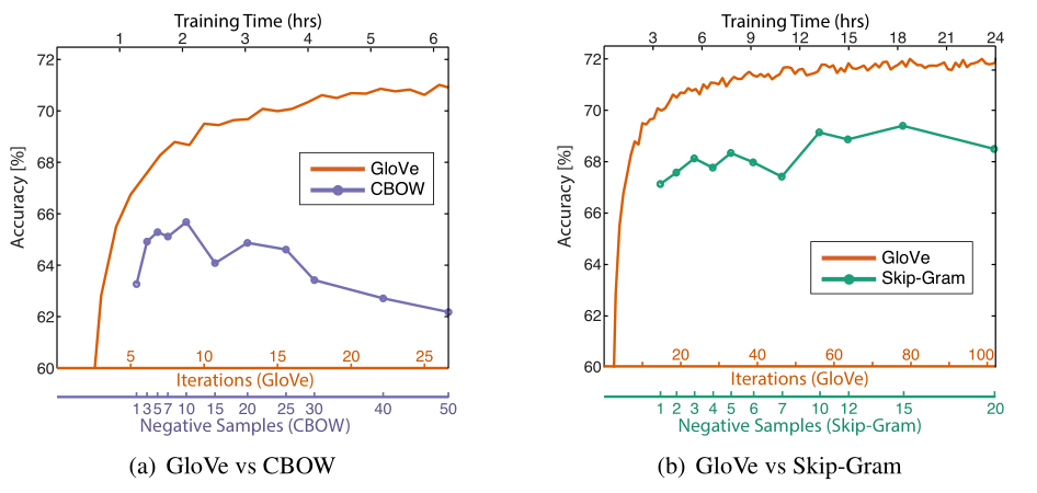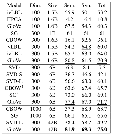 对于相同的语料库、词汇量、窗口大小和训练时间,GloVe模型的表现都优于word2vec。