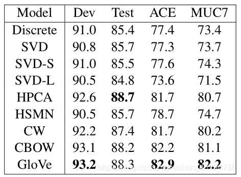 标记为Discrete的模型是基线,使用了斯坦福NER模型的标准分布所附带的一组全面的离散特征,但没有词向量特征