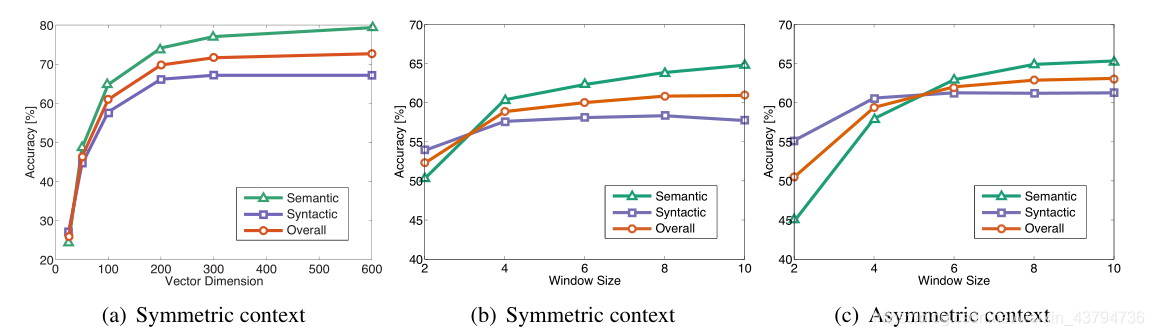 另外,对于小而不对称的上下文窗口,语法子任务(syntactic subtask)的性能更好,这与直觉一致,即语法信息主要来自于直接的上下文,并且对词序依赖性较强