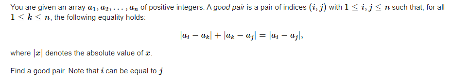 {int n,i,j,t;cin>>t;while(t--){cin>>n;for(i=0;i<n;i++){cin>>a[i].v;a[i].idx=i+1;}sort(a,a+n,cmp1);cout<<a[0].idx<<" "<<a[n-1].idx<<endl;}return 0;