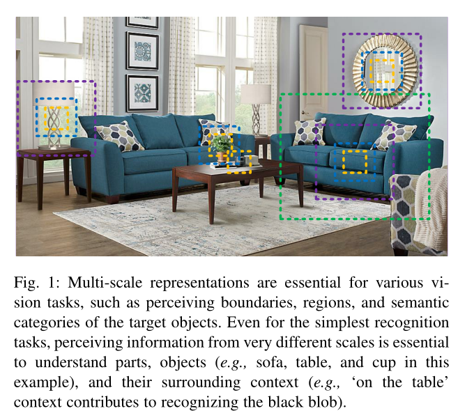 图1:多尺度表示对于各种视觉任务是必不可少的,例如感知目标对象的边界、区域和语义类别。即使对于最简单的识别任务,从非常不同的尺度感知信息对于理解部件、对象(例如,本例中的沙发、桌子和杯子)及其周围环境(例如,“桌上”环境有助于识别黑色斑点)也是必不可少的。