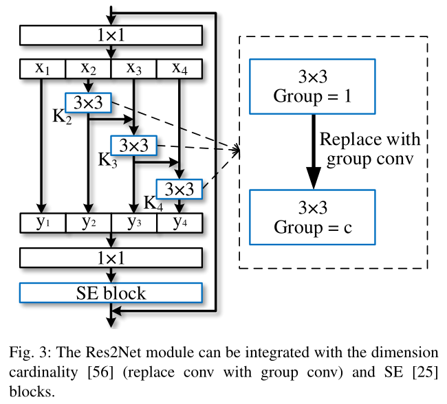 图3:Res2Net模块可以与维度基数[56]和SE[25]块集成(用组conv替换conv)。