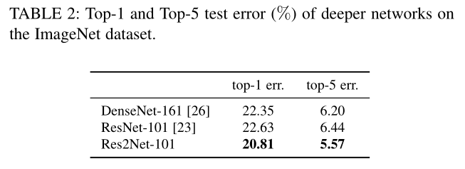 更深层的网络已经被证明具有更强的视觉任务表示能力[23],[56]。为了更深入地验证我们的模型,我们比较了Res2Net和ResNet在101层上的分类性能。如表2所示,与ResNet-101相比,Res2Net-101以1.82%的最大误差获得了显著的性能提升。注意,相对于ResNet-50,Res2Net-50在前1个错误方面的性能增益为1.84%。这些结果表明,所提出的具有额外维度尺度的模块可以与更深层次的模型集成,以获得更好的性能。我们还将我们的方法与DenseNet[26]进行了比较。与官方提供的DenseNet家族中性能最好的型号DenseNet-161相比,Res2Net-101的前1误差提高了1.54%。