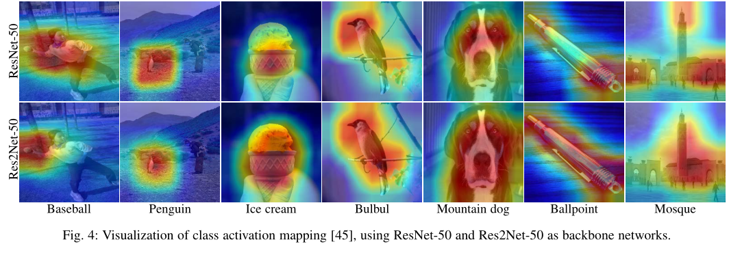图4:类激活映射的可视化[45],使用ResNet-50和Res2Net-50作为骨干网络。