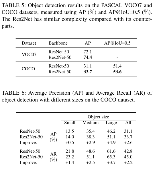 表5:PASCAL VOC07和COCO数据集上的目标检测结果,使用AP(%)和AP@IoU=0.5(%)进行测量。RES2NETs与同类相比具有类似的复杂性。