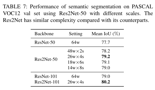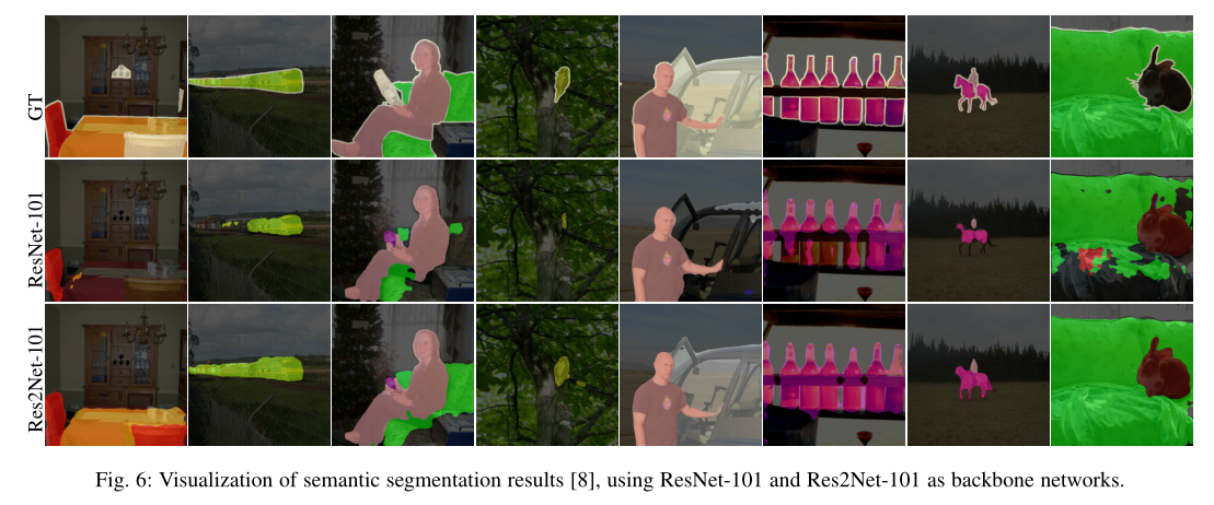 语义分割要求CNNs具有很强的多尺度能力,能够提取出对象的基本上下文信息。因此,我们使用PASCAL VOC12数据集[16]评估Res2Net在语义分割任务中的多尺度能力。我们遵循前面的工作,使用增广PASCAL VOC12数据集[20],其中包含10582个训练图像和1449个val图像。我们使用Deeplab v3+[8]作为分割方法。除了骨干网被ResNet和我们提议的Res2Net取代之外,所有的实现都与Deeplab v3+[8]保持一致。训练和评估中使用的输出跨步都是16。如表7所示,基于Res2Net-50的方法在平均IoU上比其对应的方法好1.5%。而基于Res2Net101的方法在平均IoU上的性能比其同类方法高出1.2%。图6展示了在具有挑战性的例子上语义分割结果的视觉比较。基于Res2Net的方法倾向于分割对象的所有部分,而不考虑对象的大小。如表6所示,我们进一步测试不同大小物体的AP和平均召回(AR)分数。根据文献[33],物体根据大小分为三类。基于Res2Net的模型在小对象、中对象和大对象AP上的改进幅度分别为0.5%、2.9%和4.9%。小、中、大目标的AR改善率分别为1.4%、2.5%和3.7%。基于Res2Net的模型具有很强的多尺度能力,能够覆盖大范围的感受野,提高了对不同尺寸物体的性能。