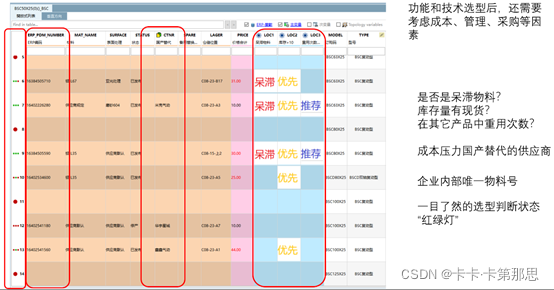 优选信息来自企业的ERP系统。工程师在考虑技术指标的同时,还能一目了然的看到物料呆滞状态、库存以及在其他产品中重用的次数。如果需要考虑成本,还可以查看是否存在国产替代。工程师甚至不需要仔细对比判断这些参数,只需要看SPM提供的状态灯就可以:绿灯可以用,黄灯请注意,红灯禁用。这样优选过程几乎不占用工程师的设计时间,完美地实现查找重用比新建更快的目标。