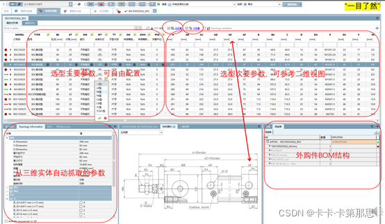 在具体产品的选型过程中,SPM能做到所有参数一目了然!比如选型一款气缸,技术资料上的产品参数和图纸标注可以对照查看。缸径、行程等主要选型参数可以按需配置,模型本身的尺寸、重量等参数也非常清晰,并且可以看到BOM结构。在保证技术选型准确的前提下,工程师还可以在同一个窗口看到优选信息,SPM系统还会展示产品的三维预览以及推荐外形相似的类似产品。