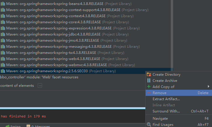 解决:jar冲突所致,file-Project Structure-Artifacts-选中项目,spring的版本使用的是4.3.8,删除如下图所示的选项