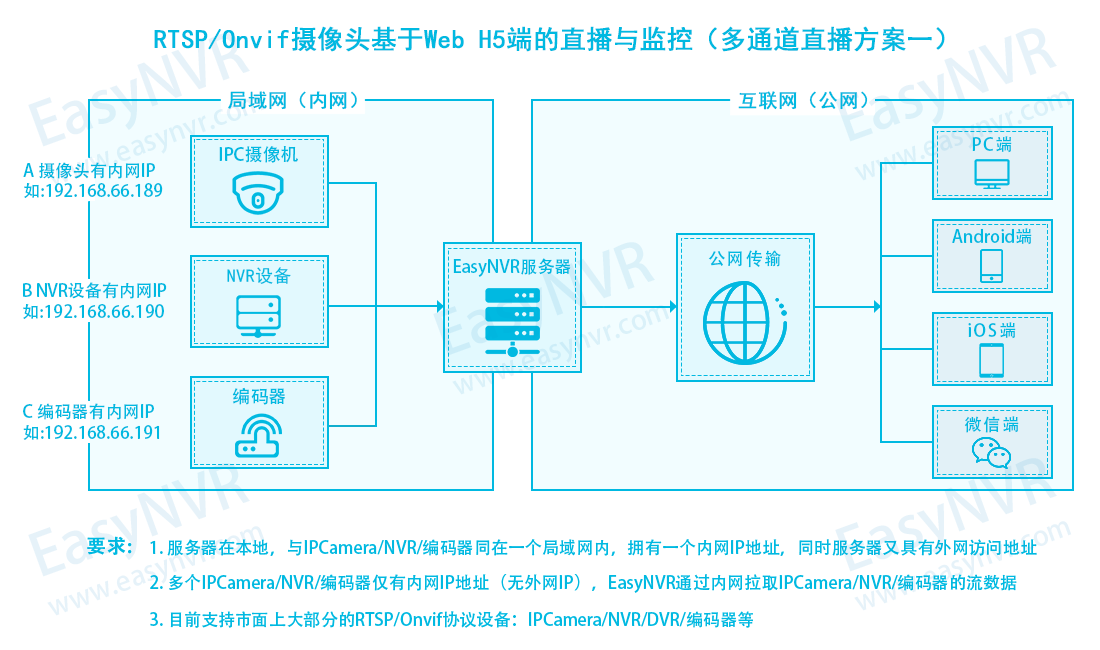 随着雪亮工程、明厨亮灶、手机看店、智慧幼儿园监控等行业开始将传统的安防摄像头进行互联网、微信直播,我们知道摄像头直播的春天了。将安防摄像头或NVR上的视频流转成互联网直播常用的RTMP、HTTP-FLV、HLS等流格式再分发给用户端进行直播,不管身处何地都可以通过移动通讯设备查看监控设备,这些功能是EasyNVR互联网直播系统研发和设计的初衷和基础功能。另外EasyNVR增值功能是可通过接口二次集成在自己的原有的web业务系统实现网页、H5无插件实时直播。