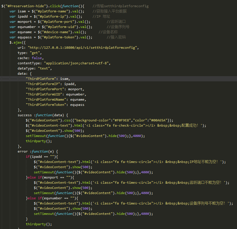 这里是通过点击事情的方式来将页面的内容传输给后台,在success :function(data)中写入传输成功后的提示,这里的thirdparty();是我们定义获取后台数据的方法,成功后我们再次运行这个方法,就能使得页面的内容刷新。error :function(e)这是传输错误的提示,将失败的原因提示给用户。