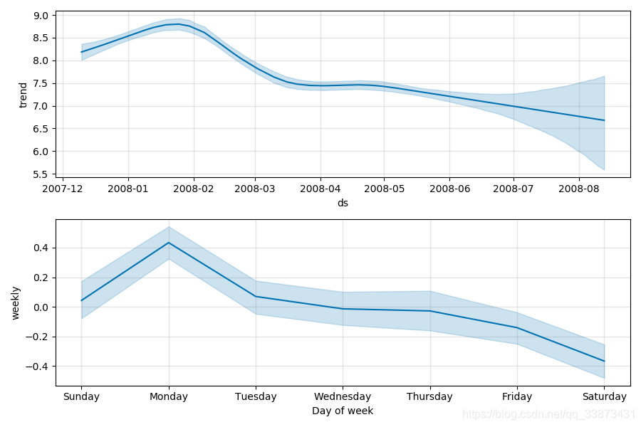 import pandas as pddef main():df = pd.read_csv('./data/example_wp_log_peyton_manning.csv')df = df.loc[:180, ] # Limit to first six monthsm = Prophet()m.fit(df)future = m.make_future_dataframe(periods=60)# 趋势的不确定性forecast = Prophet(interval_width=0.95).fit(df).predict(future)# 季节性的不确定性m = Prophet(mcmc_samples=300)forecast = m.fit(df).predict(future)fig = m.plot_components(forecast)fig.show()if __name__ == "__main__":main()