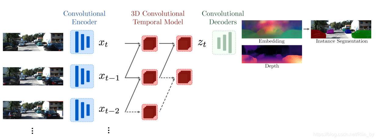 用ResNet18作为Encoder,得到每一帧的feature x_t;然后用3D卷积,把前后两者特征再滤波得到z_t;z_t通过Decoder(2个分支,每个分支7层卷积,3个upsample,Embedding分支的output通道数为p,Depth通道数为1)