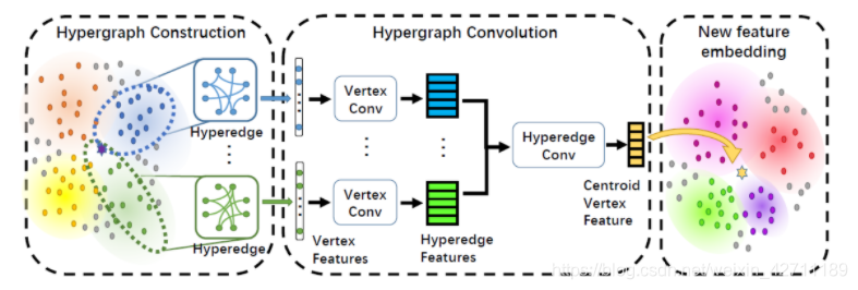对于超图中的每一个顶点u,先经过动态超图构建过程生成多条超边,然后对每一条超边分别进行顶点卷积,得到该超边的特征,然后对这些超边特征再进行超边卷积,最后得到中心顶点u新的特征。整个过程就是一个更新顶点u特征的过程,这样就可以根据顶点u的性特征构建新的超图,不断循环。