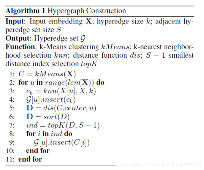 首先根据欧氏距离对每一层的整个特征图进行k-means算法。对每一个输入节点u,通过knn算法找到和该节点最相似的k-1个节点,连同顶点u形成一个超边;同时根据k-means的聚类结果将离定点u最近的S-1簇被赋值为与该顶点相邻的超边。
