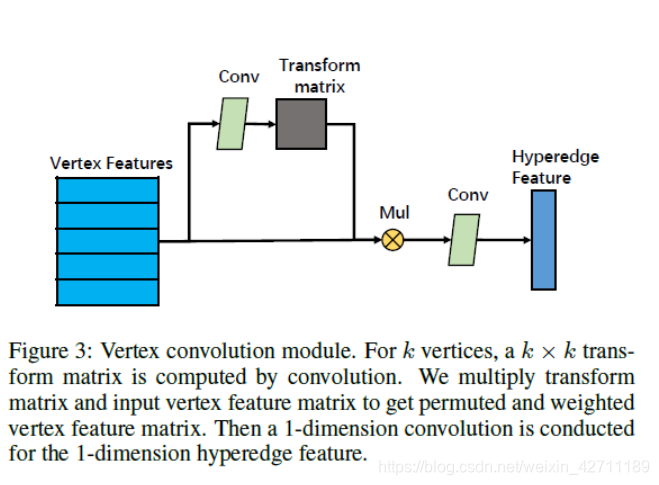 从顶点特征中学习得到一个k ∗ k的变换矩阵T,将矩阵T与输入顶点特征矩阵相乘,得到排列加权的顶点特征矩阵。然后经过一个一维卷积操作进行维度的压缩,最后得到包含这些节点的超边的特征。