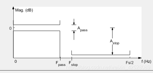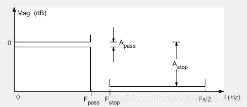 比较后发现: 设计滤波器需要关注的参数,采样率Fs,Fpass 通带频率,Fstop 阻带频率,Fpass 和Fstop 之间的为过渡带。Apass 是通带增益,Astop是 阻带衰减。 理想滤波器的要求很多地方都有。这里只是想让大家增强滤波器的概念。