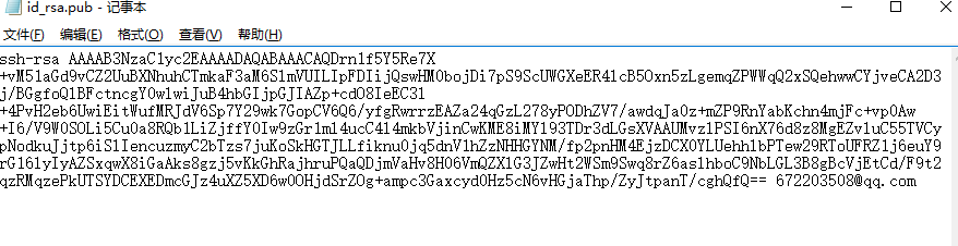 去根据该路径找到 id_rsa.pub文件,使用记事本打开。你会看到一大串字符,如下是我获取到的key