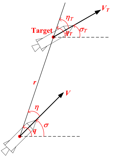 η代表速度和目标视线的夹角,η是导弹前置角,是目标前置角。