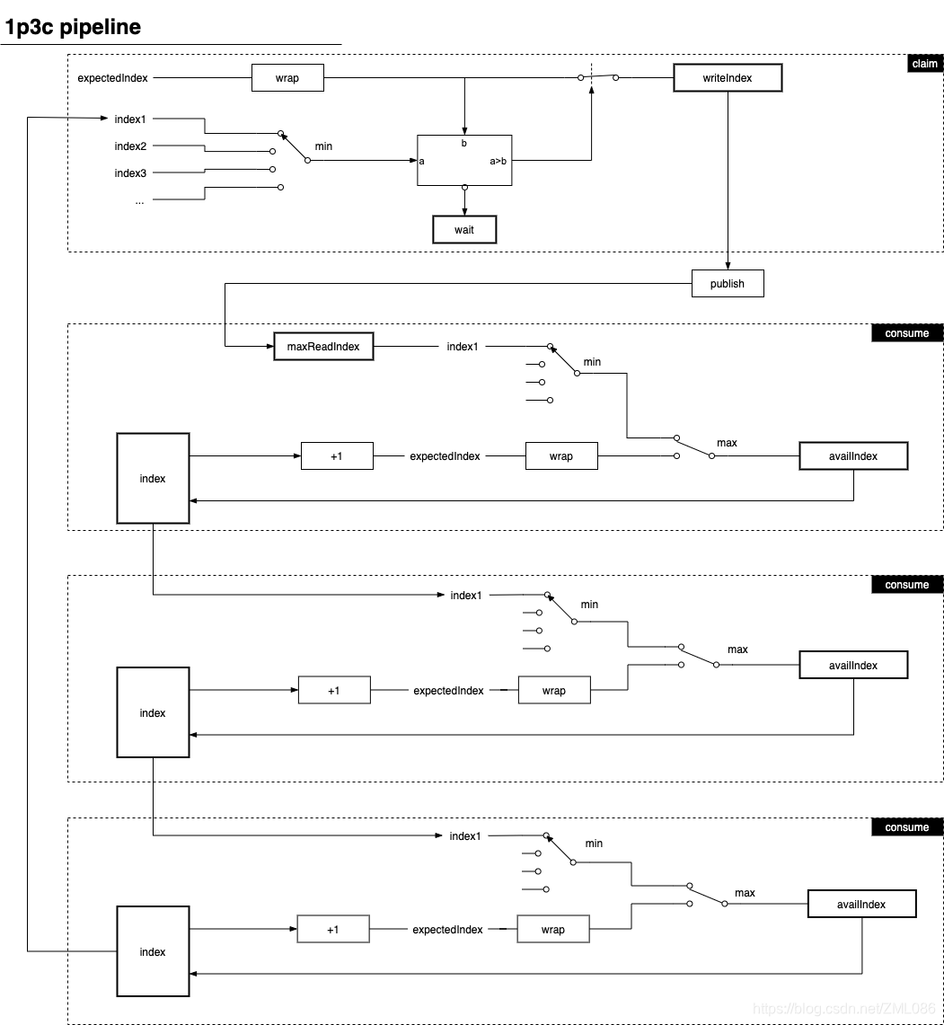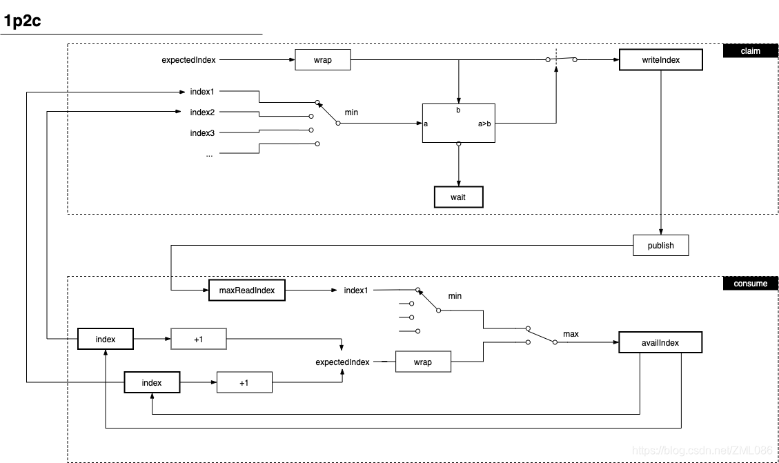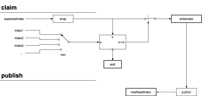 图中,index1,index2,... 就是 Gating Sequences 数组; wrap 操作是减去 bufferSize,这样就方便比较 expectedIndex 有没有覆盖到队首。