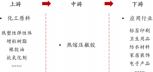 (4)热熔压敏胶产业链情况概述:热熔压敏胶产业链的上游主要为化工原料生产商,例如中石油集团、中石化集团等。上游原材料的价格水平对于热熔压敏胶产品生产价格具有直接影响,同时上游行业的产品质量对热熔压敏胶产品质量有直接影响。