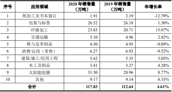热熔压敏胶在纤维加工行业的应用主要包括一次性卫生材料、医疗用品等。热熔压敏胶在建筑施工行业的应用主要包括路面防水、隧道防水、屋顶防水等。发行人高分子防水材料系列热熔压敏胶主要应用于建筑施工市场。由上表可知,2018-2020年,包装与标签市场、纤维加工市场及建筑施工市场的热熔压敏胶销量占总热熔压敏胶销量的比重为84.52%、88.64%和89.76%,上述市场2019年度和2020年度合计销量增长率为13.88%和18.63%,是当前热熔压敏胶主要的应用领域。
