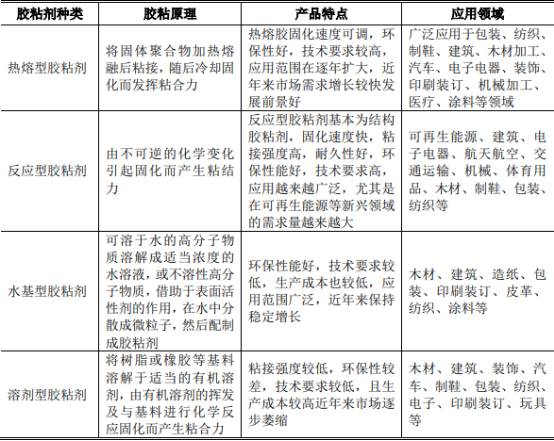 (2)产品的环保要求不断提高:随着我国环保意识的日益提高以及环保法规的日趋完善,对胶粘剂及粘接过程的效率和环境污染防控也提出了越来越高的要求,水基型、热熔型、无溶剂型、紫外光固化型、高固含量型及生物降解型等环境友好型热熔胶的市场关注度越来越高,环保节能型产品将成为主流。