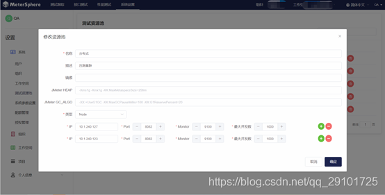 访问【系统设置】→【系统】→【测试资源池】,单击【创建资源池】,添加Slave压力机,填写IP,Port,Monitor和最大并发数。