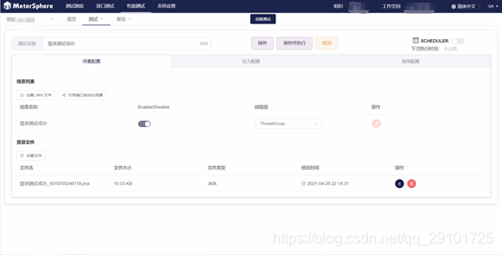 点击【性能测试】→【创建测试】,点击【场景配置】→【加载JMX文件】→【上传JMX文件】添加压测脚本。