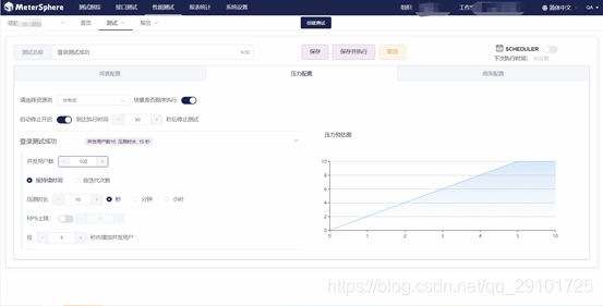 点击【压力配置】设置发压参数设置,比如选择资源池,并发用户数,时长等。