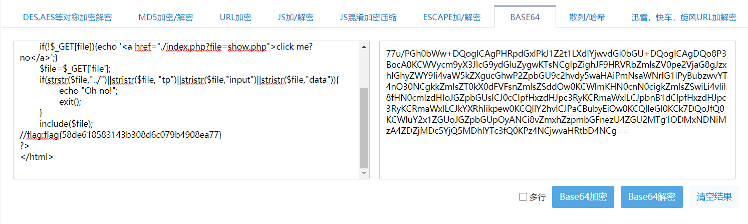 77u/PGh0bWw+DQogICAgPHRpdGxlPkJ1Z2t1LXdlYjwvdGl0bGU+DQogICAgDQo8P3BocA0KCWVycm9yX3JlcG9ydGluZygwKTsNCglpZighJF9HRVRbZmlsZV0pe2VjaG8gJzxhIGhyZWY9Ii4vaW5kZXgucGhwP2ZpbGU9c2hvdy5waHAiPmNsaWNrIG1lPyBubzwvYT4nO30NCgkkZmlsZT0kX0dFVFsnZmlsZSddOw0KCWlmKHN0cnN0cigkZmlsZSwiLi4vIil8fHN0cmlzdHIoJGZpbGUsICJ0cCIpfHxzdHJpc3RyKCRmaWxlLCJpbnB1dCIpfHxzdHJpc3RyKCRmaWxlLCJkYXRhIikpew0KCQllY2hvICJPaCBubyEiOw0KCQlleGl0KCk7DQoJfQ0KCWluY2x1ZGUoJGZpbGUpOyANCi8vZmxhZzpmbGFnezU4ZGU2MTg1ODMxNDNiMzA4ZDZjMDc5YjQ5MDhlYTc3fQ0KPz4NCjwvaHRtbD4NCg==