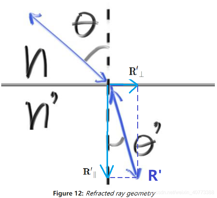 我们可以将折射光线R分解为两个向量:平行于n'的分量和垂直于n'的分量,如下式所示:
