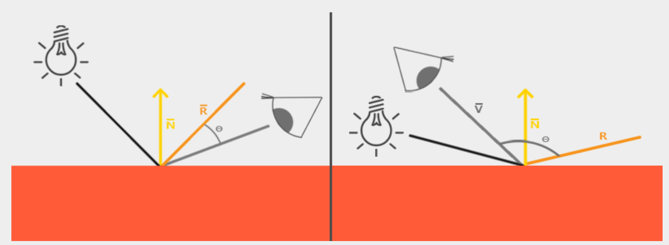 Phong 和 Blinn-Phong 着色之间的另一个细微差别是中间向量和表面法线之间的角度(blinn-phong)通常小于视图和反射向量之间的角度(phong)。 因此,要获得类似于 Phong 着色的视觉效果,必须将镜面反射光泽指数设置得更高一些。 一般的经验法则是将其设置在 Phong 光泽指数的 2 到 4 倍之间。